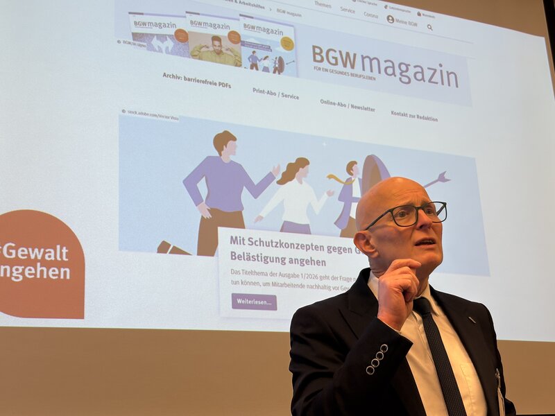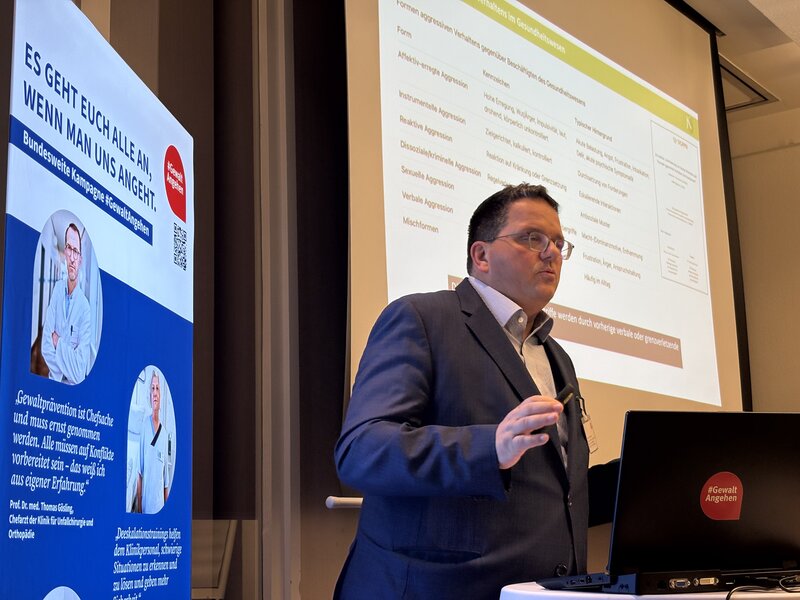 - Jörg Schudmann, Hauptgeschäftsführer der BGW, und Michael May, Geschäftsführer des GUV Oldenburg, informierten, wie sie die Kampagne #GewaltAngehen der Deutschen Gesetzlichen Unfallversicherung (DGUV) nutzen und welche Unterstützungsangebote sie für Kliniken und Einrichtungen anbieten.